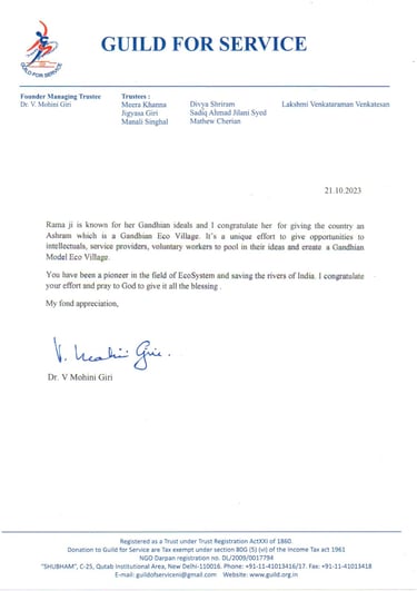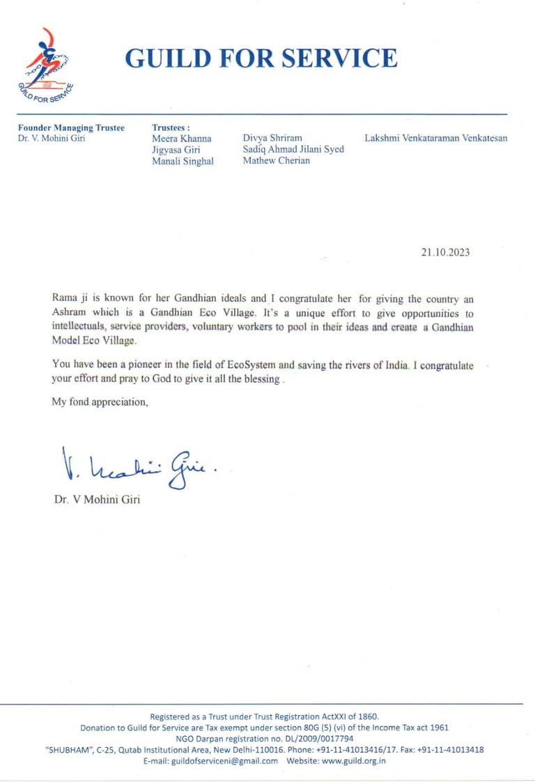 We are deeply sorry to know that Dr V Mohini Giri passed away on 19th December. She was 85 years old and a great noble soul and a great social activist who worked selflessly for widows and through her organisation 'Guild of Service' for under privileged women and children till the end of her life considering her work as worship to God in the spirit of the Bhagavad Gita. She was a true Gandhian with deep respect for Mahatma Gandhi and his thought and as patron of our National Women's Organization, Pune worked for our Save Ganga Movement as a guide and helping us to organise some Save Ganga seminars / meetings and participating in them. Last time when we were talking about our Gandhian Modern Eco-village Piolet Project in Odisha, she expressed her deep anguish about the pathetic condition of our mother Ganga and our other great river mothers. Her message for our Gandhian Modern Eco-village Piolet Project in Odisha is attached here with.